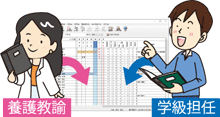 生徒の出欠席情報はデータベースで一元管理され、学級担任からも養護教諭からも閲覧・編集が可能